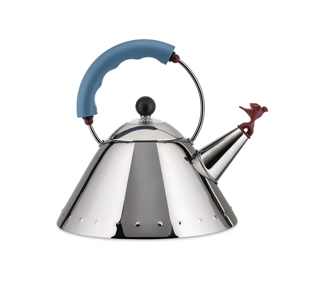 Alessi 9093 bollitore con l’uccellino che fischia segnalando che l’acqua bolle, una intramontabile icona di Alessi, disegnato da Michael Graves. Una fusione postmoderna di stili che spazia dal decò al pop. Manico azzurro e uccellino rosso. Adatto ai piani ad induzione. Diametro 22 centimetri, altezza 22,5 centimetri, capacità 2 litri.
